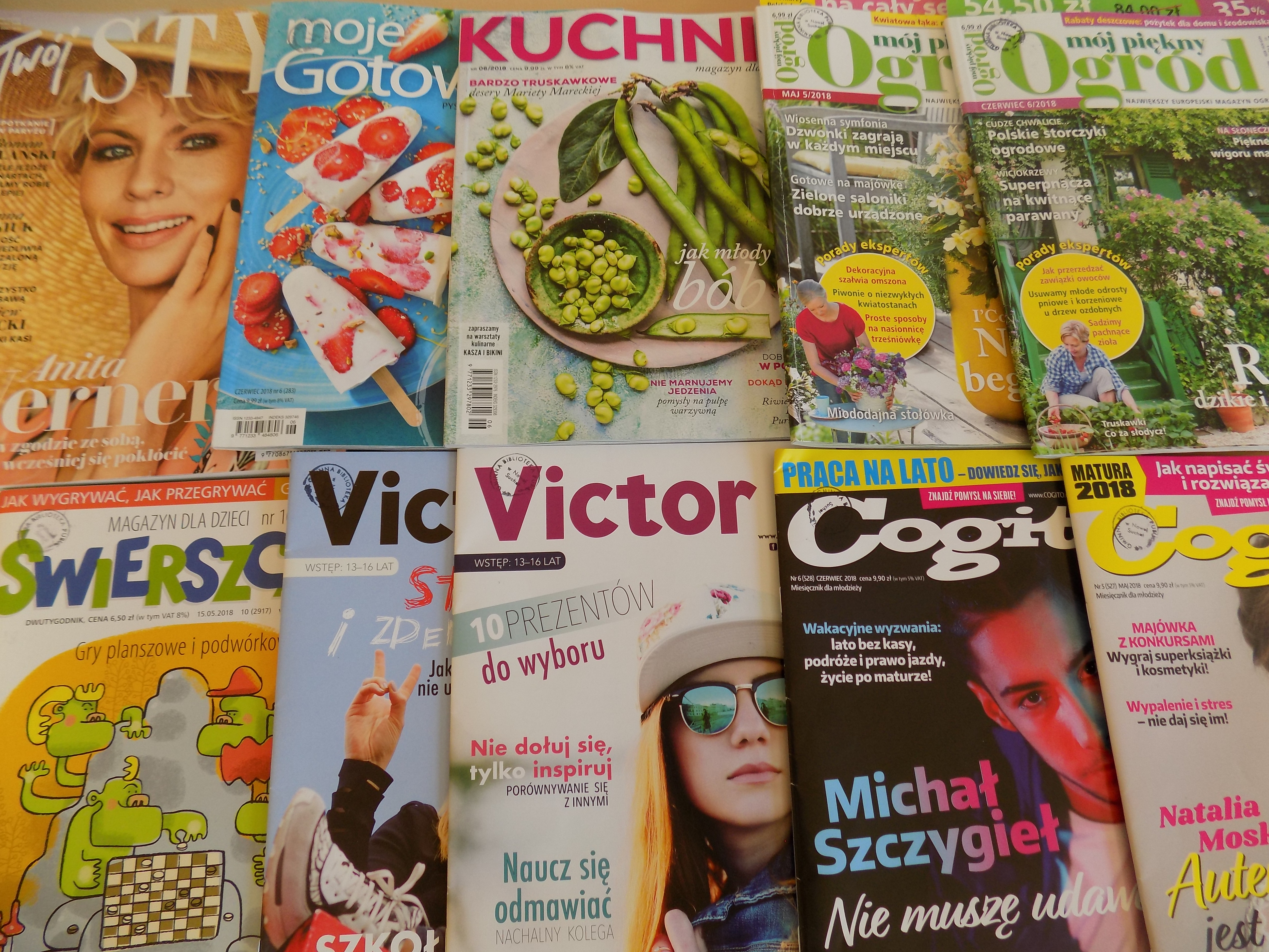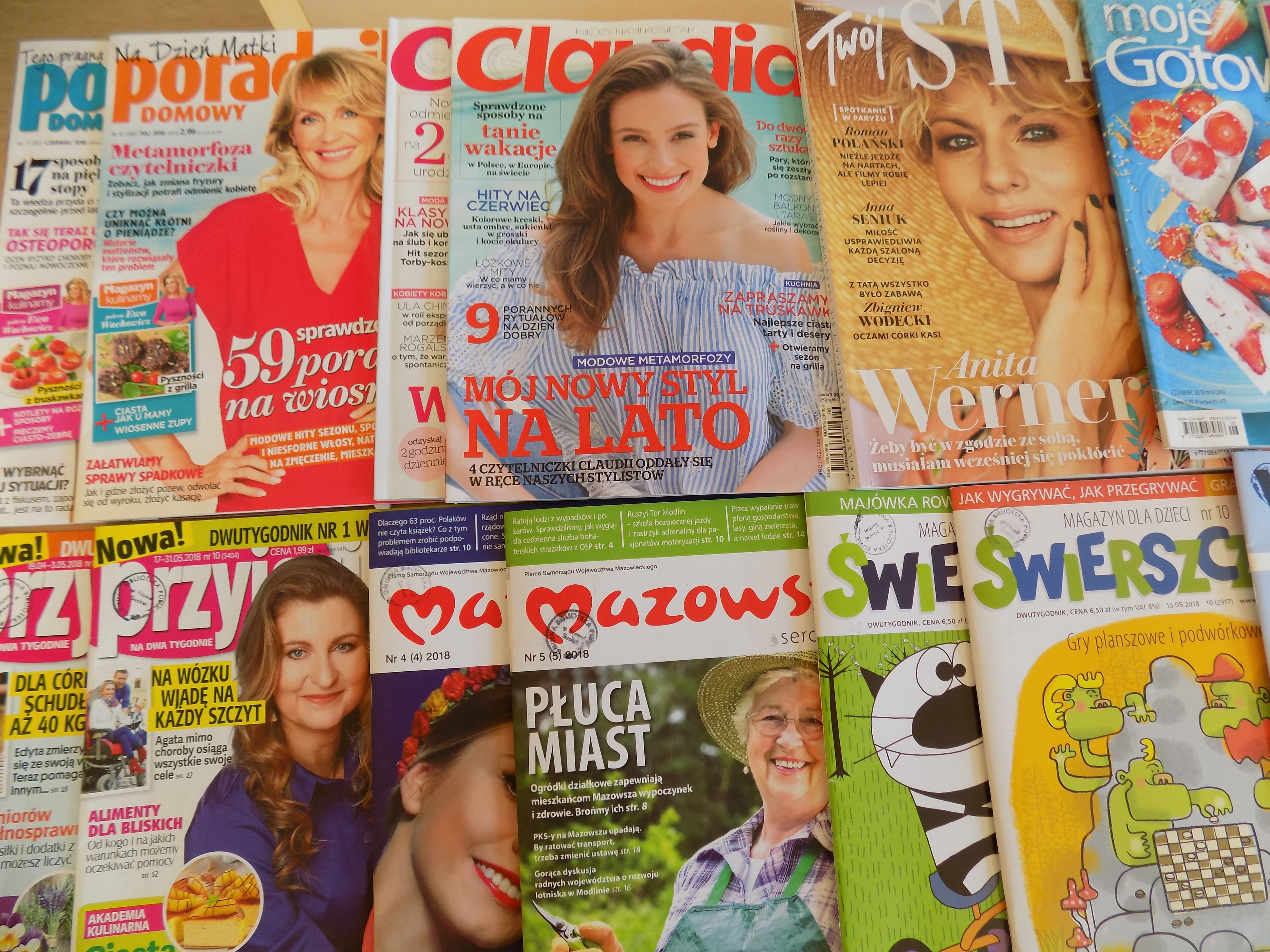 W naszej Bibliotece mamy dostępne aktualne numery czasopism, takich jak: Poradnik Domowy, Przyjaciółka, Twój Styl, Moje Gotowanie, Mazowsze, Kuchnia, Mój Piękny Ogród, Świerszczyk, Victor, Cogito oraz Claudia.