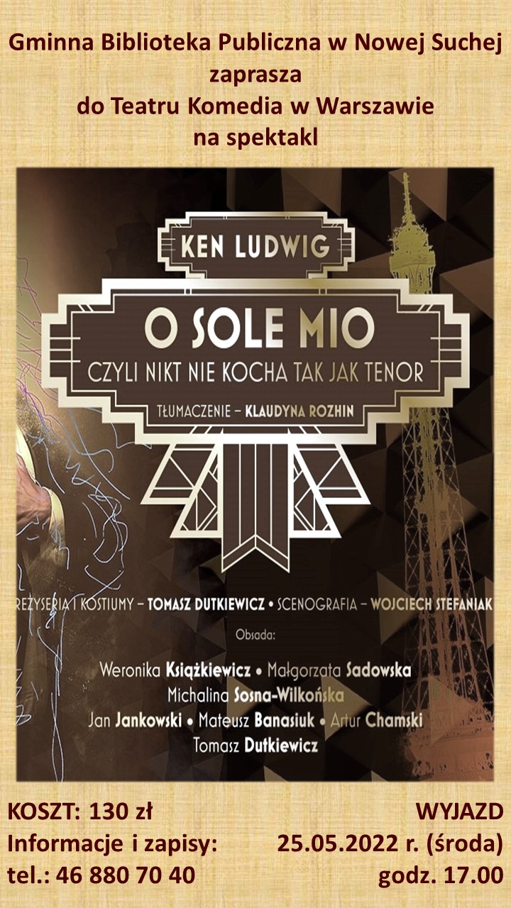 Wyjazd do Teatru Komedia w Warszawie na spektakl pt.: "O sole mio, czyli nikt nie kocha tak jak tenor"Gminna Biblioteka Publiczna w Nowej Suchej zaprasza do Teatru Komedia w Warszawie na spektakl pt.: „O sole mio, czyli nikt nie kocha tak jak tenor” WYJAZD: 25.05.2022 r. (środa), godz. 17.00 KOSZT: 130 zł Informacje i zapisy: tel.: 46 880 70 40