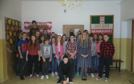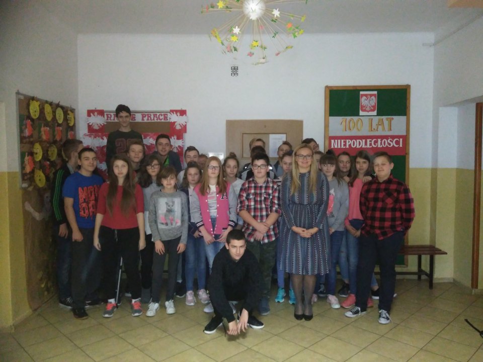 Temat zajęć dla klasy VII i VIII brzmiał: Józef Piłsudski – twórca Niepodległej. Uczniowie wysłuchali bardzo interesującego wykładu, obejrzeli prezentację multimedialną oraz fragmenty filmu dokumentalnego z pogrzebu Józefa Piłsudskiego. Pani Adamus odpowiadała na pytania zadawane przez uczniów, ale chwaliła także ich wiedzę historyczną. Na koniec wykonaliśmy pamiątkowe zdjęcie przy gazetce ze znamiennym napisem – 100 LAT NIEPODLEGŁOŚCI. Tak właśnie w naszej szkole nadal czcimy rocznicę niepodległości.