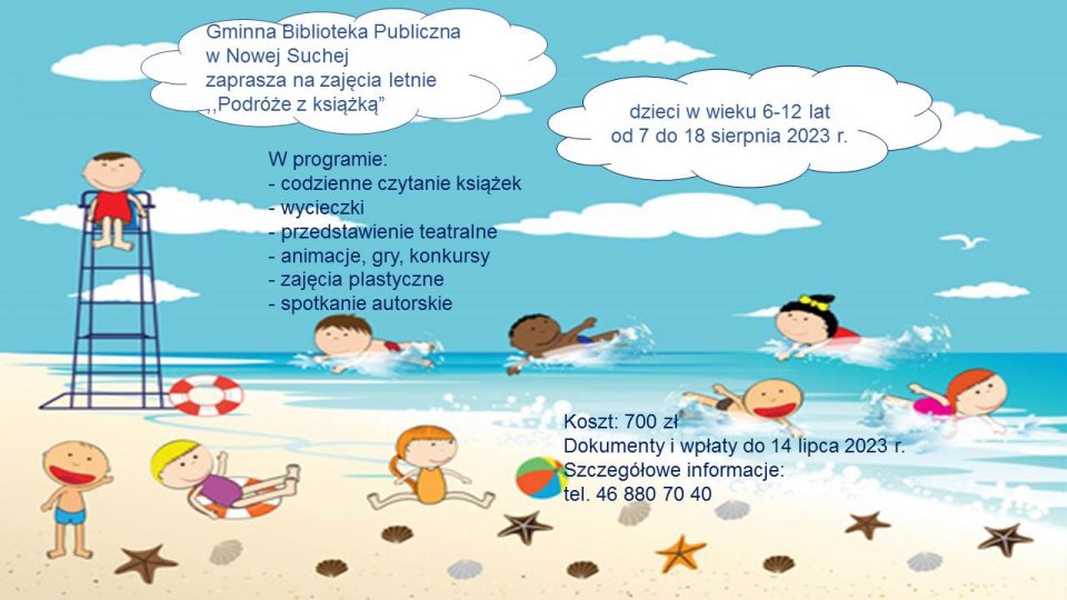 Nabór na wakacyjne zajęcia „Podróże z książką” dla dzieci w wieku od 6 do 12 lat trwa. Prosimy o dostarczenie dokumentów i wpłaty do 14 lipca 2023 r. W przypadku dodatkowych informacji prosimy o kontakt telefoniczny, nr tel. 468807040 lub odwiedzenie Biblioteki w godzinach otwarcia, w celu pobrania wersji papierowej.