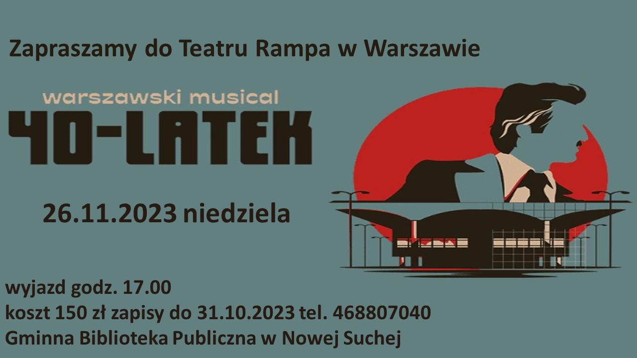 Zapraszamy do Teatru Rampa na wyjazd na warszawski musical „40-latek”! 26.11.2023 (niedziela) wyjazd godz. 17.00 koszt 150 zł Zapisy do 31.10.2023 Gminna Biblioteka Publiczna w Nowej Suchej |