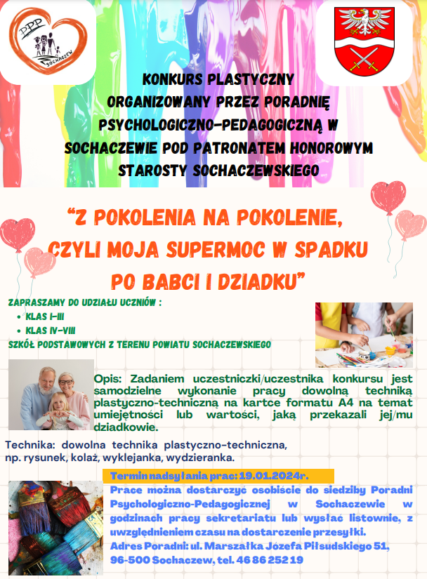 Termin nadsyłania prac: 19.01.2024r. Prace można dostarczyć osobiście do siedziby Poradni Psychologiczno-Pedagogicznej w Sochaczewie w godzinach pracy sekretariatu lub wysłać listownie, z uwzględnieniem czasu na dostarczenie przesyłki.