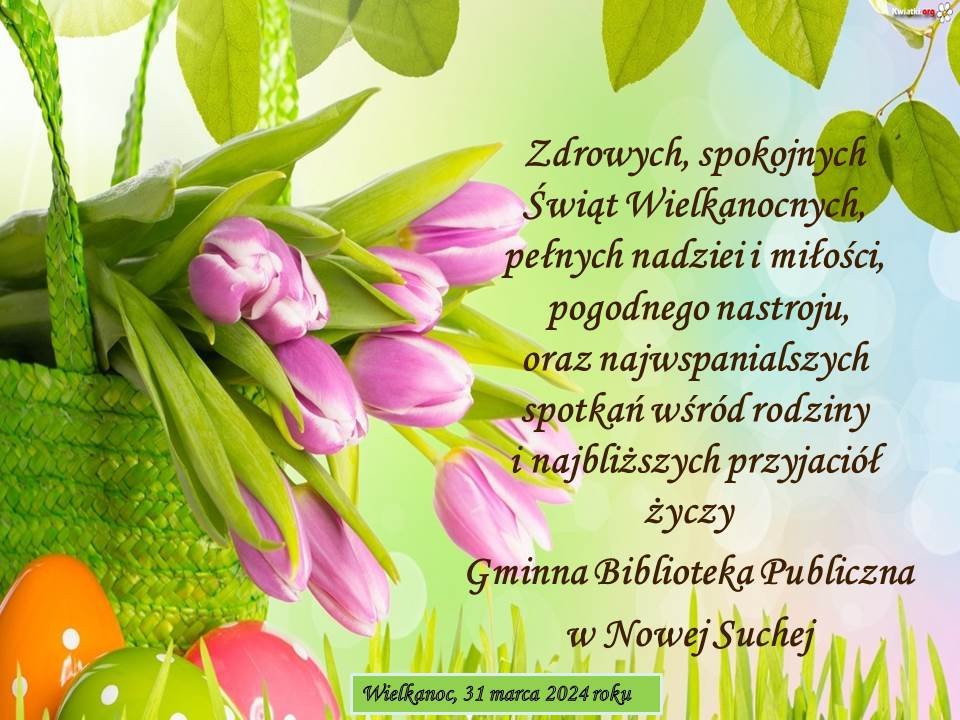Życzenia Świąteczne - Wielkanoc 2024 Piątek, 29 marzec 2024 Żeby Wielkanoc w tym roku, Przyszła z sukcesem u boku. Aby żyło się Wam zdrowo, Prywatnie i zawodowo. Wielu, wielu chwil radosnych I cudownej ciepłej wiosny Życzy Gminna Biblioteka Publiczna w Nowej Suchej