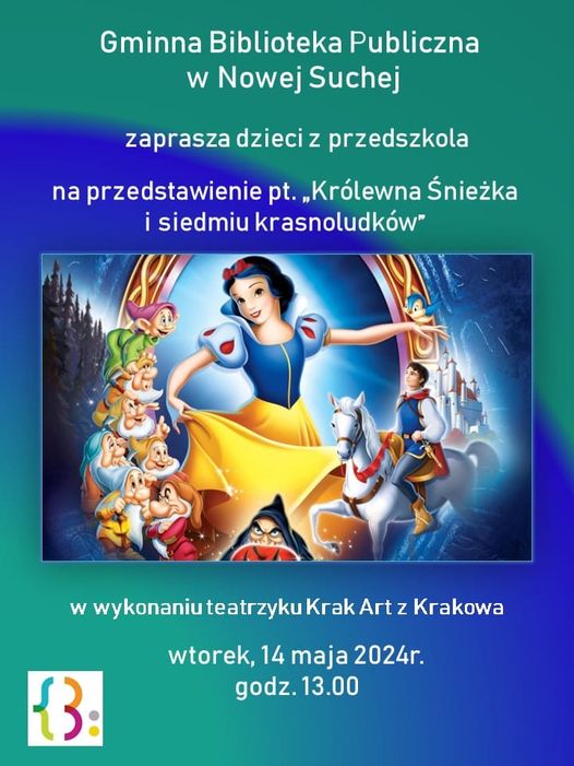 14 maja 2024 roku dzieci z przedszkola będą oglądać w Bibliotece spektakl, w wykonaniu Studia Teatralnego KRAK-ART, pt.: „Królewna Śnieżka i siedmiu krasnoludków”. Zapraszamy na godz. 13.00.