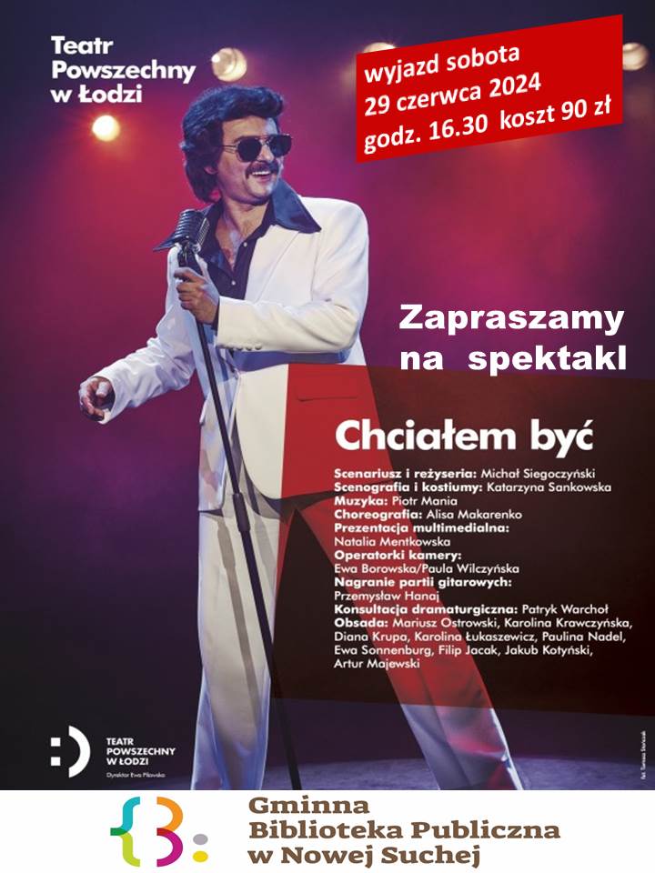 Wyjazd do Teatru Powszechnego w Łodzi na spektakl "Chciałem być"Zapraszamy do Teatru Powszechnego w Łodzi na spektakl: "Chciałem być". Wyjazd 29 czerwca 2024 r. godz. 16:30 (sobota) koszt 90 zł. Zapisy w Bibliotece, tel. 468807040