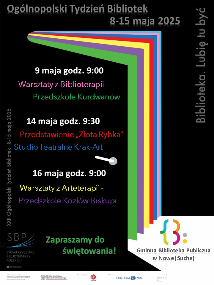 Jak co roku Gminna Biblioteka Publiczna w Nowej Suchej przygotowuje z tej okazji atrakcyjną ofertę, w której znaleźć można m.in. występy teatralne dla dzieci, warsztaty z Bajkoterapii czy zajęcia plastyczno-artystyczne. Tydzień Bibliotek obfituje w wizyty dzieci z przedszkola i szkół w naszej gminnej placówce. Podczas odwiedzin w Gminnej Bibliotece Publicznej w Nowej Suchej dzieci mają szansę dowiedzieć się jak wygląda praca bibliotekarza, zapoznać się z naszym bogatym księgozbiorem oraz zasadami obowiązującymi w Bibliotece.