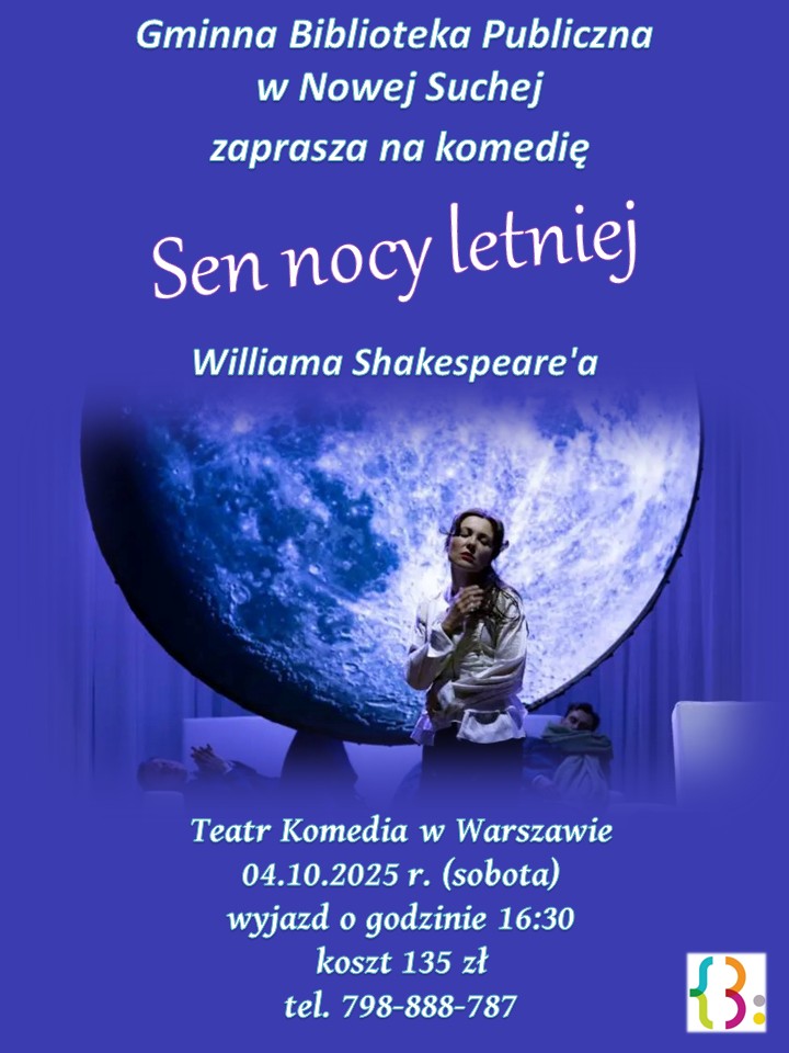 Wyjazd do Teatru Komedia na spektakl Sen nocy letniejGminna Biblioteka Publiczna w Nowej Suchej zaprasza na wyjazd do Teatru Komedia w Warszawie na spektakl „Sen nocy letniej”.Wyjazd w dniu 4 października 2025 r. (sobota) o godz. 16:30, koszt 135 zł, tel. 798-888-787.Zapraszamy do zapisów!
