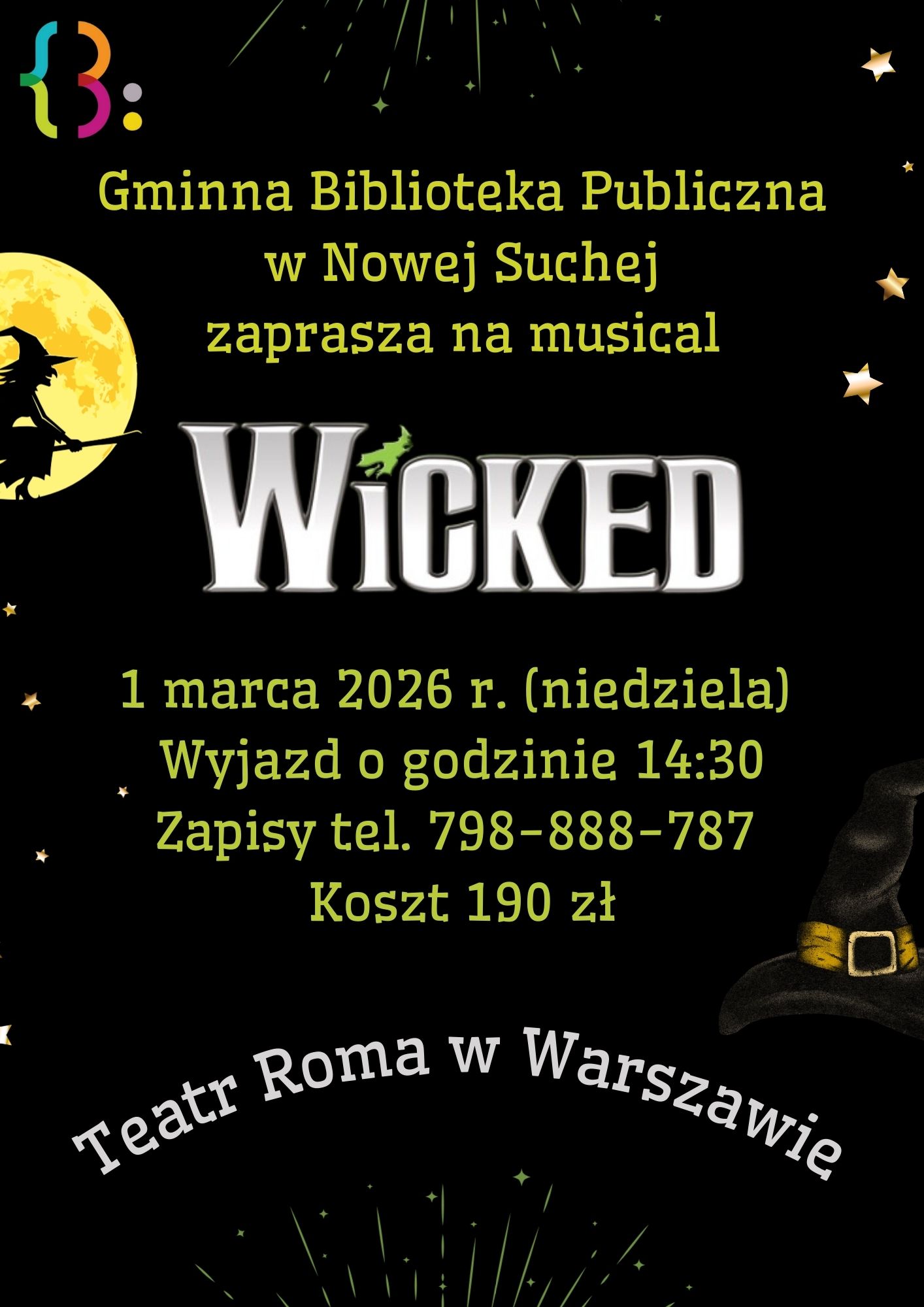 Wyjazd do Teatru Roma w Warszawie na musical WickedGminna Biblioteka Publiczna w Nowej Suchej zaprasza na wyjazd do Teatru Roma w Warszawie na musical „Wicked”. Wyjazd w dniu 1 marca 2026 r. (niedziela) o godz. 14:30, koszt 190 zł., tel. 798-888-787.Zapraszamy do zapisów!