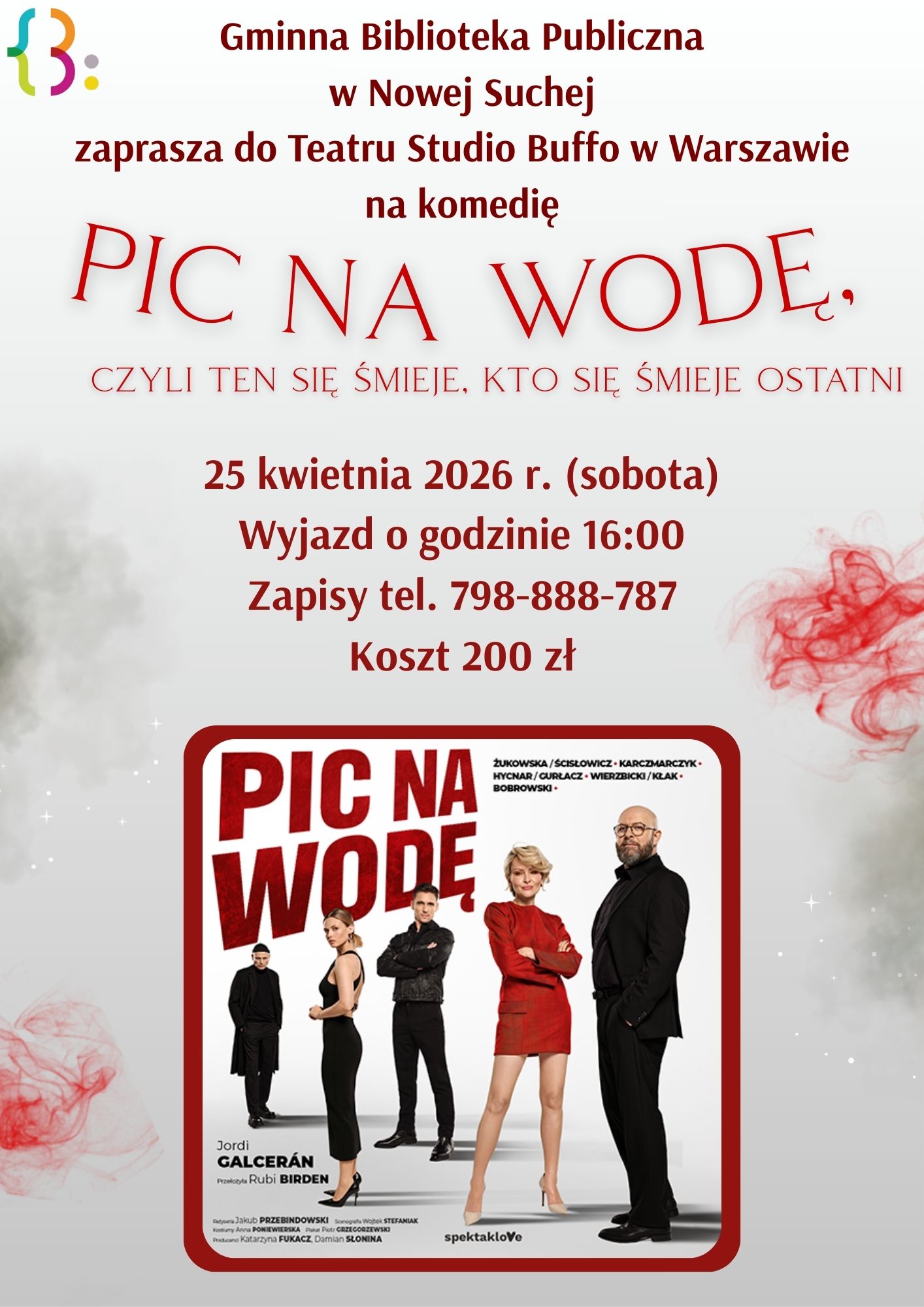 Gminna Biblioteka Publiczna w Nowej Suchej zaprasza na wyjazd do Teatru Studio Buffo w Warszawie na komedię „Pic na wodę, czyli ten się śmieje, kto się śmieje ostatni”. Wyjazd w dniu 25 kwietnia 2026 r. (sobota) o godz. 16:00, koszt 200 zł.