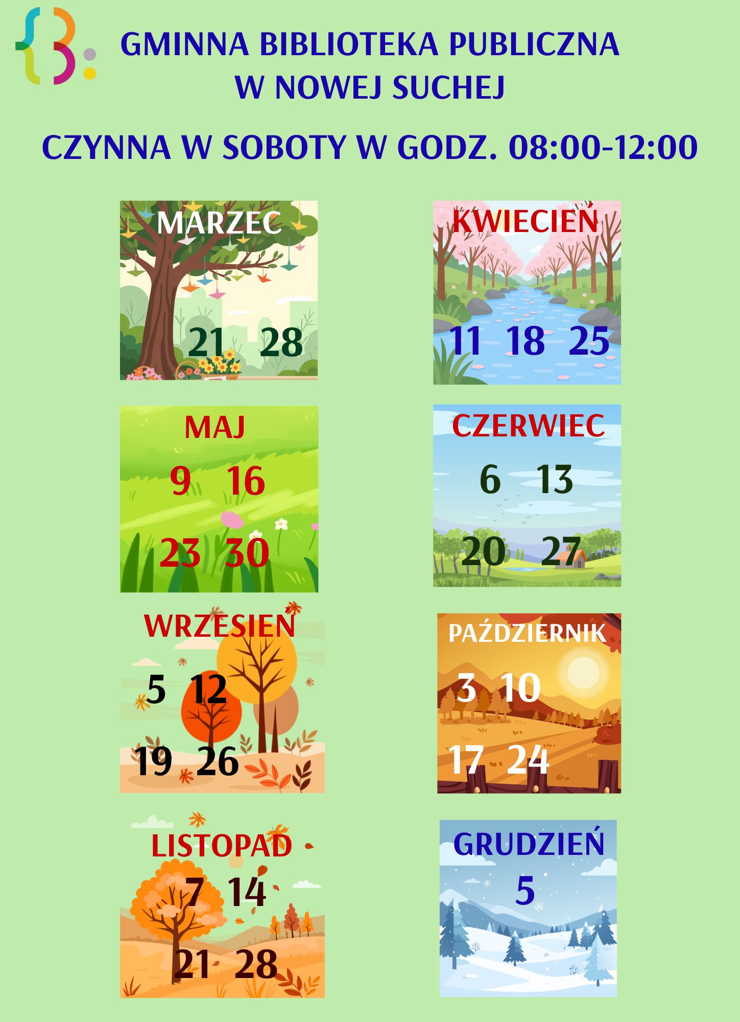Informujemy, że w 2026 roku Gminna Biblioteka Publiczna w Nowej Suchej będzie czynna w soboty według harmonogramu przedstawionego poniżej.